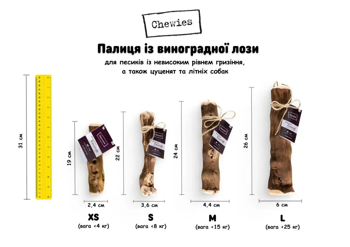 Палички з виноградної лози Chewies – безпечна та натуральна альтернатива вуличним паличкам, що дає собаці радість від жування без шкоди здоров'ю. Виготовлені з виноградної деревини, що походить з виноробних регіонів Німеччини, ці палички мають високу міцність і приємну грубу текстуру без кори, що стимулює собаку до активного гризіння.