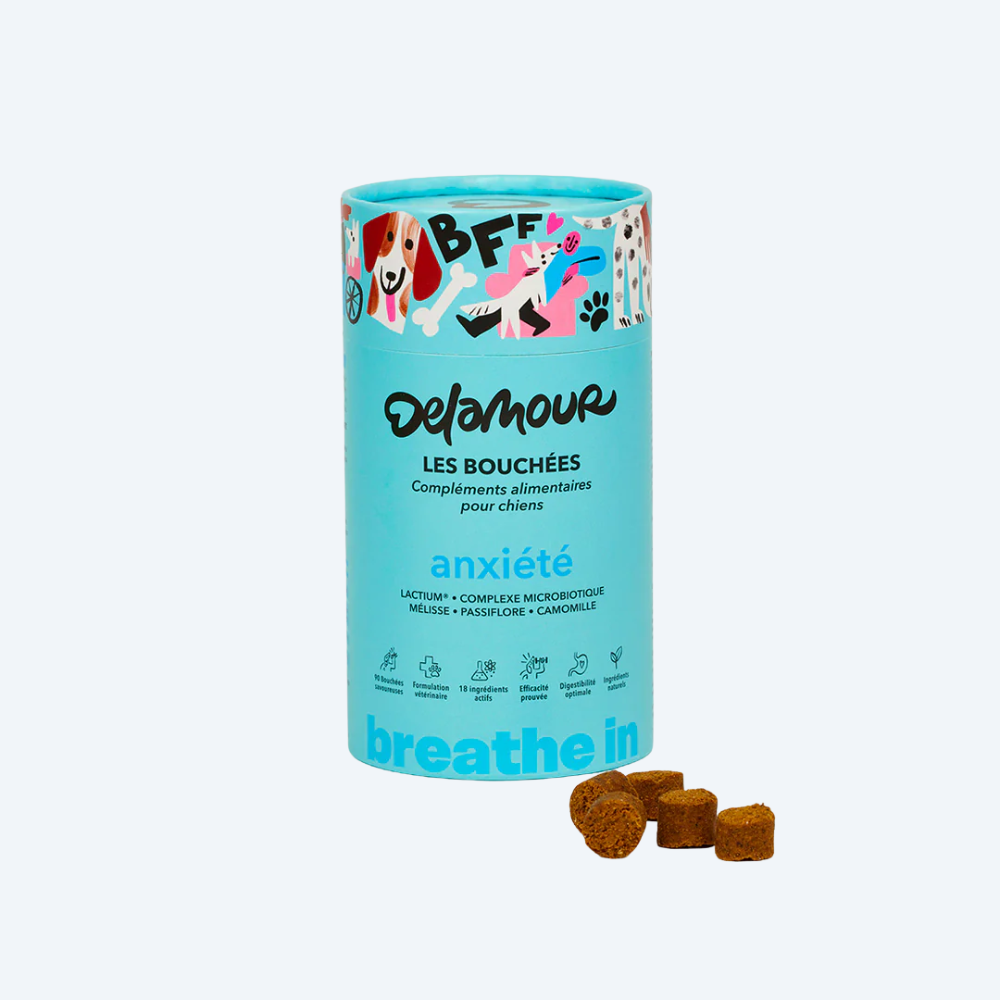 Delamour Paris Les Bouchées – Anxiété — преміальний антистресовий вітамінний комплекс для собак, створений для м’якого та безпечного зниження тривожності. Формула заснована на натуральних екстрактах, амінокислотах та вітамінах, які підтримують нервову систему та сприяють емоційній рівновазі.