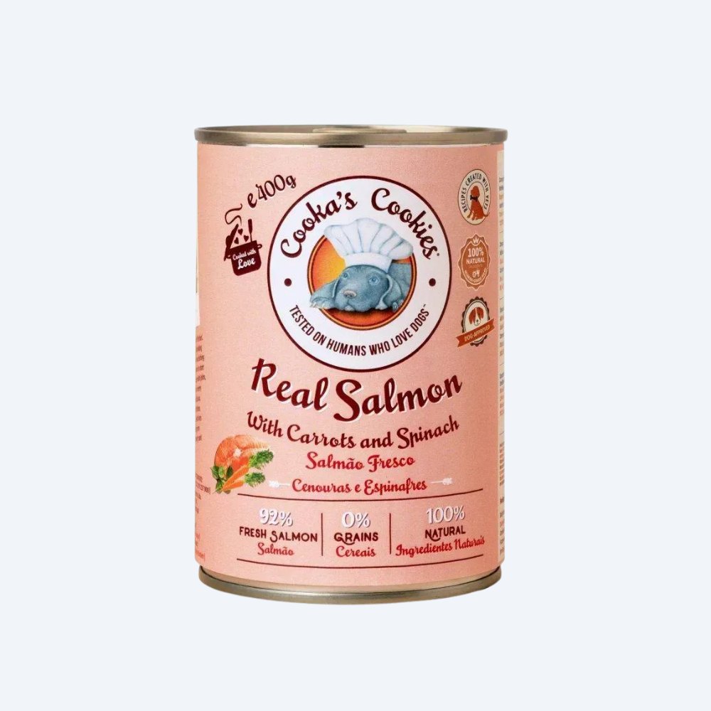 Cooka's Cookies 92% Лосось з морквою та шпинатом — це збалансований та натуральний вологий корм, створений для підтримки здоров’я собак усіх порід.